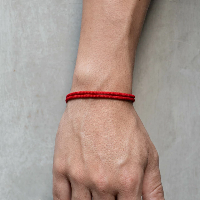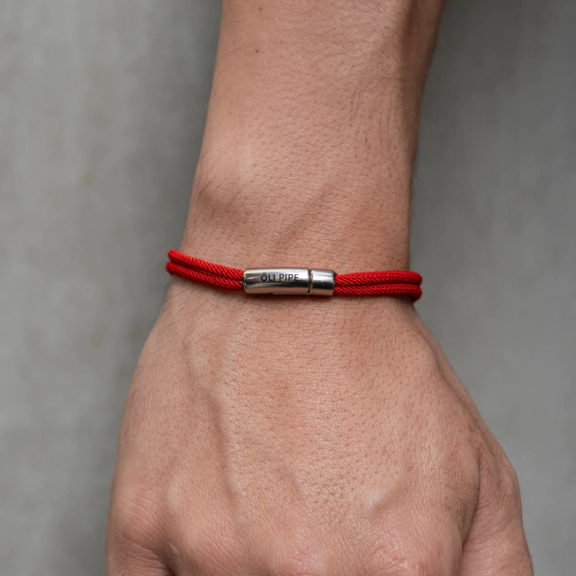 Pulseira dupla em fio sintético vermelho com fecho de imã metálico.