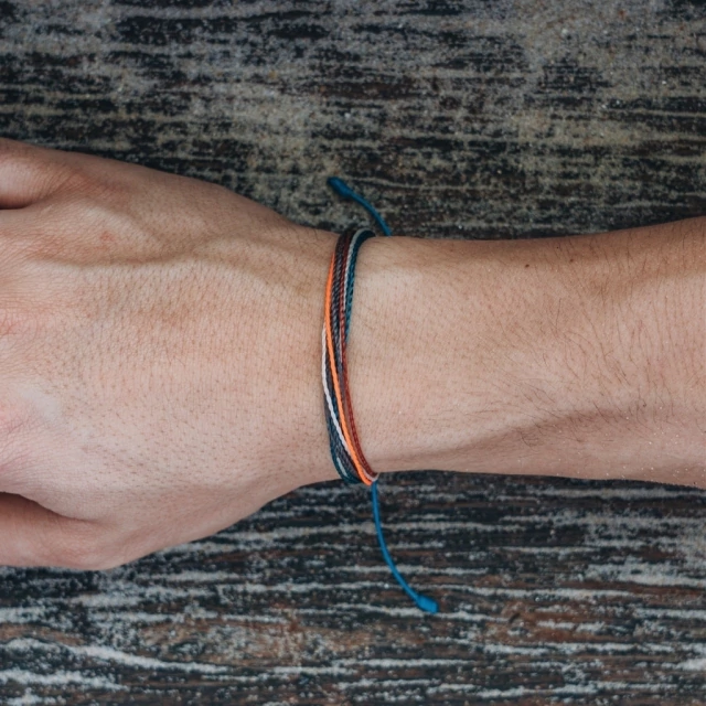 Pulseira multifios nos tons creme, azul petróleo, cinza, bordô e laranja.