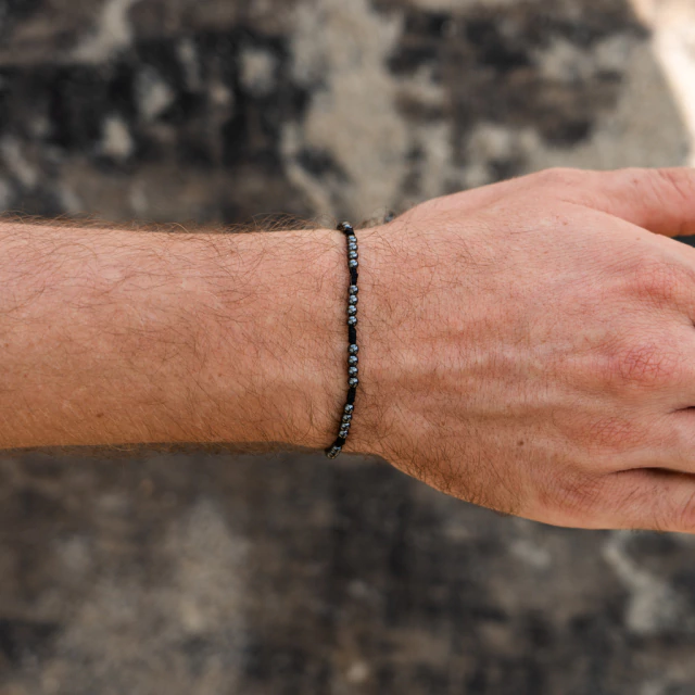Pulseira feita de pedra Hematita 3mm, com detalhes em fio sintético