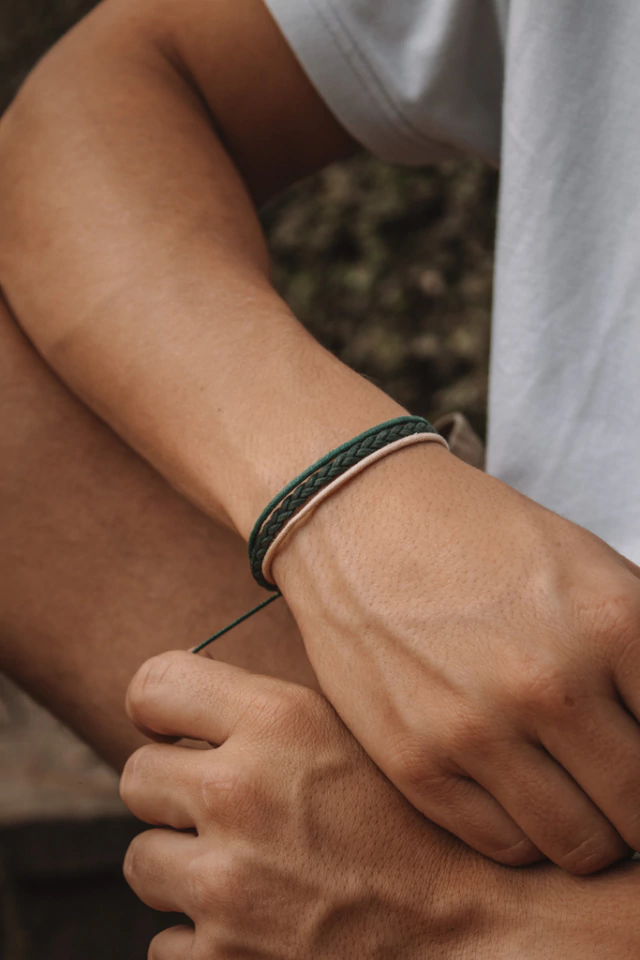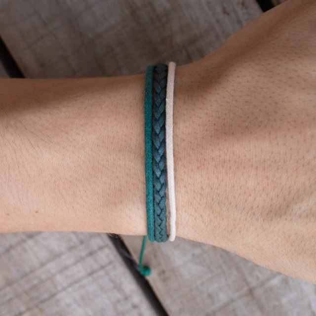 Pulseira tripla de algodão em tons de verde e creme.